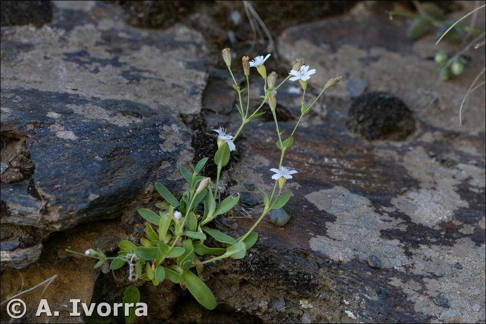 Planta perenne, hasta de 15 cm., multicaule, glabra. Tallos ramificados en la base, erectos o ascendentes. Hojas basales numerosas, oblanceoladas u oblongo-lanceoladas; las caulinares opuestas, lanceoladas o elípticas. Flores en dicasios compuestos, actinomorfas, hermafroditas, pentámeras. Pedicelos más largos que los sépalos. Cáliz campanulado en la antesis, glabro, umbilicado, con 10 nervios no anastomosados; dientes obtusos, con ancho margen escarioso.