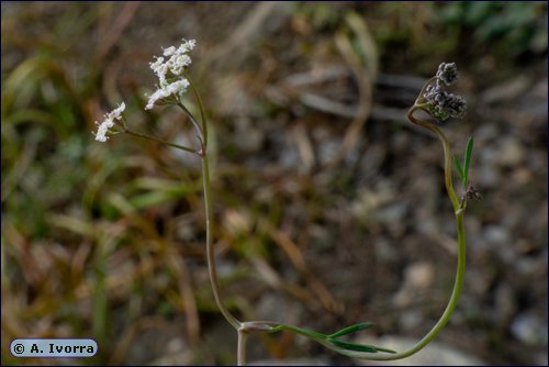 Planta perenne, hasta de 15 cm. con un tubérculo de 1 a 1,5 cm de diámetro. Tallos delgados, flexuosos en la parte subterránea, ramosos. Ramas formando un ángulo obtuso con el tallo. Hojas basales con largos pecíolos parcialmente subterráneos, de contorno triangular, 1-2 pinnatisectas, con segmentos pinnatipartidos o simples; las caulinares medias pinnatisectas, con segmentos lineares o linear-espatulados, las caulinares superiores de trisectas a simples,