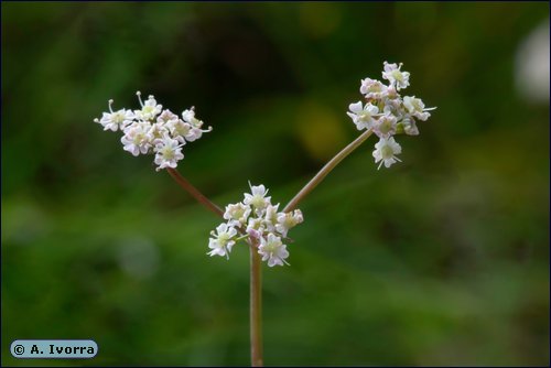 sentadas. Umbelas compuestas, con 3 a 5 radios, hasta de 10 mm de longitud, la principal de flores hermafroditas, las laterales de masculinas; brácteas 1 a 2, lanceoladas, emarginadas. Umbélulas con 6 a 15 radios; bractéolas 1 a 5, lanceoladas. Flores actinomorfas, pentámeras; pétalos emarginados o no, homogéneos, blancos o algo rosados. Estilos de patentes a reflejos o adpresos al estilopodio. Frutos elipsoides; mericarpos con costillas primarias prominentes; carpóforo no engrosado y muy poco peloso.