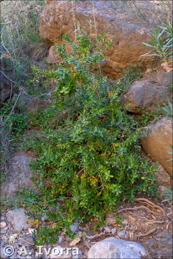 Arbusto monoico, perennifolio, en general de 1 a 2 metros de altura. Las ramillas jóvenes son cuadrangulares. Hojas enteras, hasta de unos 4 cm, elípticas y decusadas (hojas opuestas que se disponen en sentido perpendicular con las del nudo contiguo). Flores en grupos axilares, siendo pediceladas y femeninas las superiores, y sésiles y masculinas, las inferiores. La flor femenina presenta un gineceo tricarpelar y trilocular, con tres estilos libres. El fruto es una cápsula, dehiscente en tres