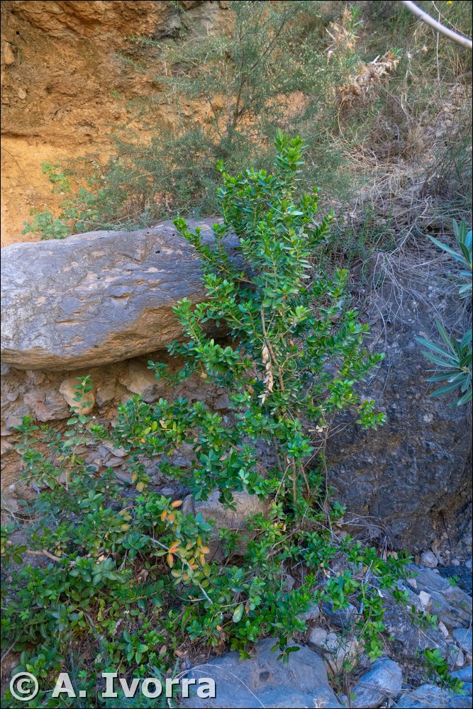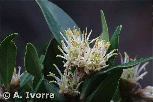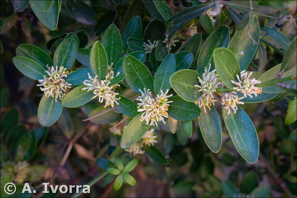 Esta especie se distingue del boj (Buxus sempervirens ) por sus hojas algo
