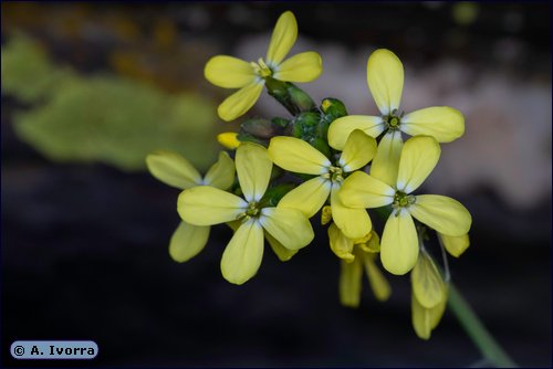 base. Corola con 4 pétalos libres, amarillos, de 9-15 mm. Androceo con 6
