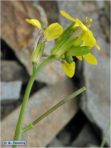 estambres, tetradínamo. Ovario súpero. Fruto tipo silicua, hasta de 50 mm, linear. Semillas uniseriadas, negruzcas, de 1 mm.