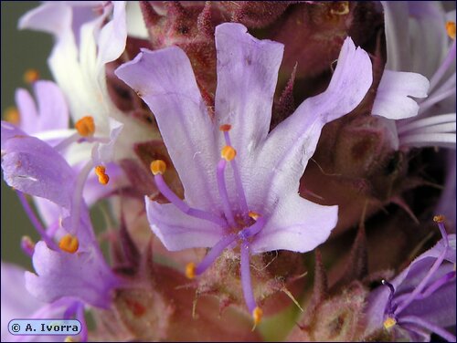 desiguales y bífidos, de color rosa o azulado. Androceo con 5 estambres. Ovario