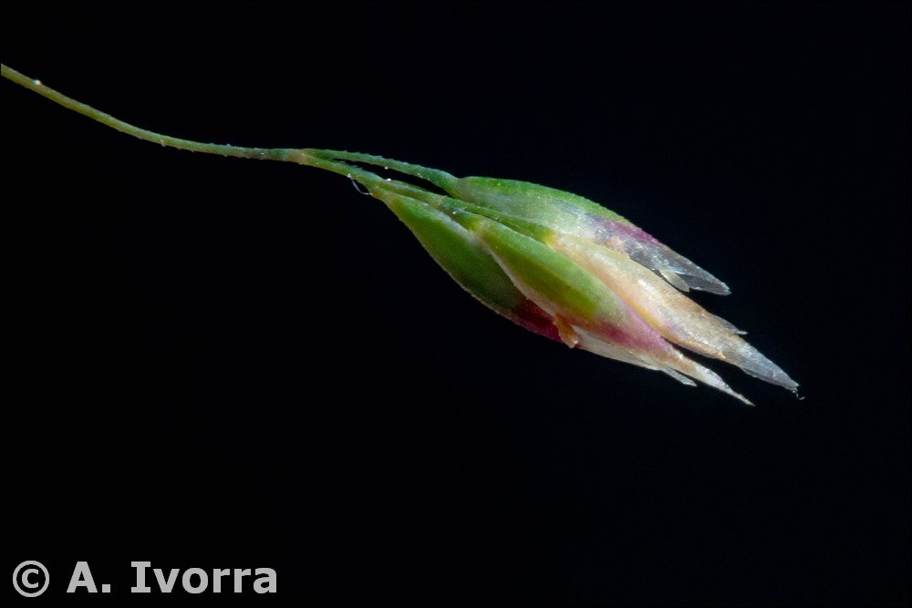 Hierba anual, hasta de 45 cm. Tallos simples o ramificados en los nudos inferiores, glabros. Hojas planas, glabras vaina ligeramente púrpura lígula membranácea, aguda. Panícula laxa, con ramas inferiores muy cortas y con las espiguillas dispuestas en la mitad distal. Espiguillas comprimidas lateralmente, con 2 flores glumas más largas que las flores, subiguales, lanceoladas, agudas lema con 5 nervios, subobtuso, con arista dorsal articulada y provista