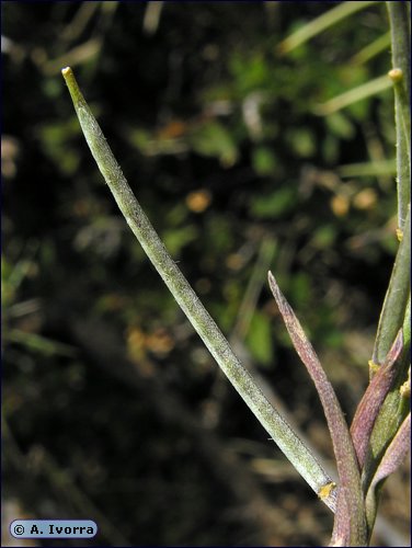 bicarpelar, con estilo de unos 2 mm. Frutos erecto-patentes, tipo silicua, lineares, hasta de 40 mm.