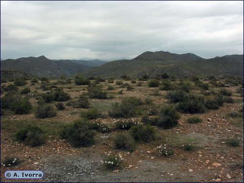 Granada, Jaén. En Almería se halla en Gérgal, Desierto de Tabernas, P. N. Cabo de Gata-Níjar...