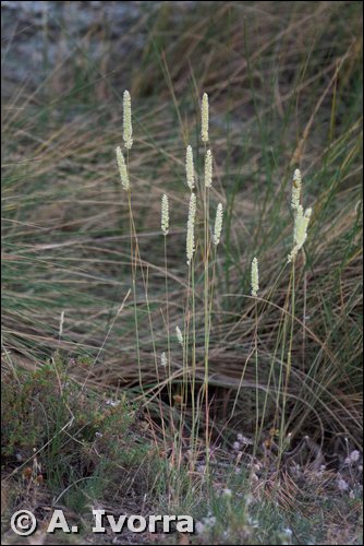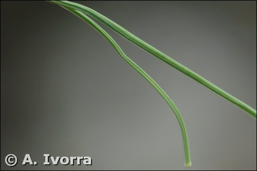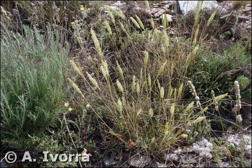 Hierba perenne, hasta de 70 cm, xeromorfa, densamente cespitosa, con renuevos intravaginales. Tallos floríferos normalmente glabros bajo la panícula. Tallos vegetativos con 3 a 4 hojas verdes, con vainas foliares enteras, membranáceas cuando secas, persistentes y adheridas al tallo, cuya base aparece engrosada, de un color pardo, de glabrescentes a pelosas, limbo setáceo, rígido, de un verde pálido, glabro o con algún pelo vestigial hasta
