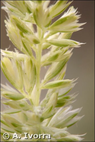 de 0,1 mm, con márgenes escábridos sin cilios. Panícula de 3 a 6 cm, habitualmente espiciforme, densa. Espiguillas con 2 o 3 flores, comprimidas lateralmente. Glumas de desiguales a subiguales gluma inferior uni- o binervada gluma superior lanceolada, de aguda a mucronada, con mucrón hasta de 0,1 mm, con quilla escábrida, glabra, trinervada. Lema de agudo a mucronado, con quilla escábrida, con dorso peloso, frecuentemente más peloso hacia el ápice.