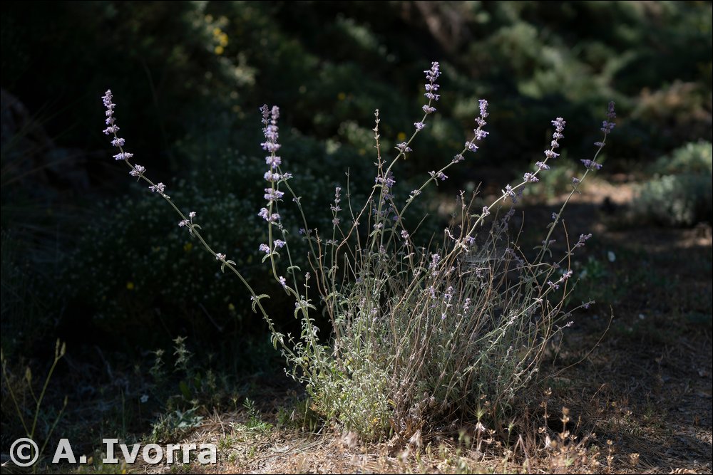 crenadas, con indumento por ambas caras, las basales con limbo ovado-triangular, de ordinario cordiforme, blanquecino, con pecíolo erizado-lanoso. Inflorescencia en espiga de verticilastros. densa; brácteas inferiores semejantes a las hojas; bractéolas más cortas