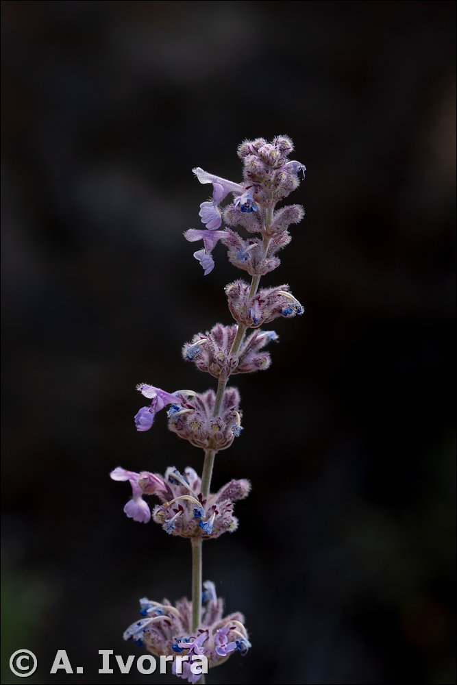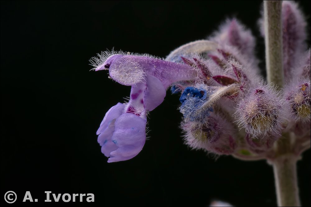 9-11 mm, bilabiada, violácea, con manchas más obscuras en el labio inferior. Filamentos estaminales blanquecinos. Núculas negras,