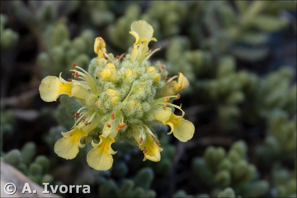 Planta sufruticosa, cespitosa o pulviniforme, con pelos ramificados largos y flexuosos. Tallos con dimorfismo estacional, los vegetativos pardo-blanquecinos y los floríferos amarillentos o amarillos. Hojas opuestas, sésiles, oblongas, cuneadas, crenadas en la mitad o en los dos tercios apicales, planas o revolutas. Inflorescencia en cabezuela terminal, oblonga. Flores zigomorfas, hermafroditas, pentámeras, sésiles. Cáliz verde o amarillo,