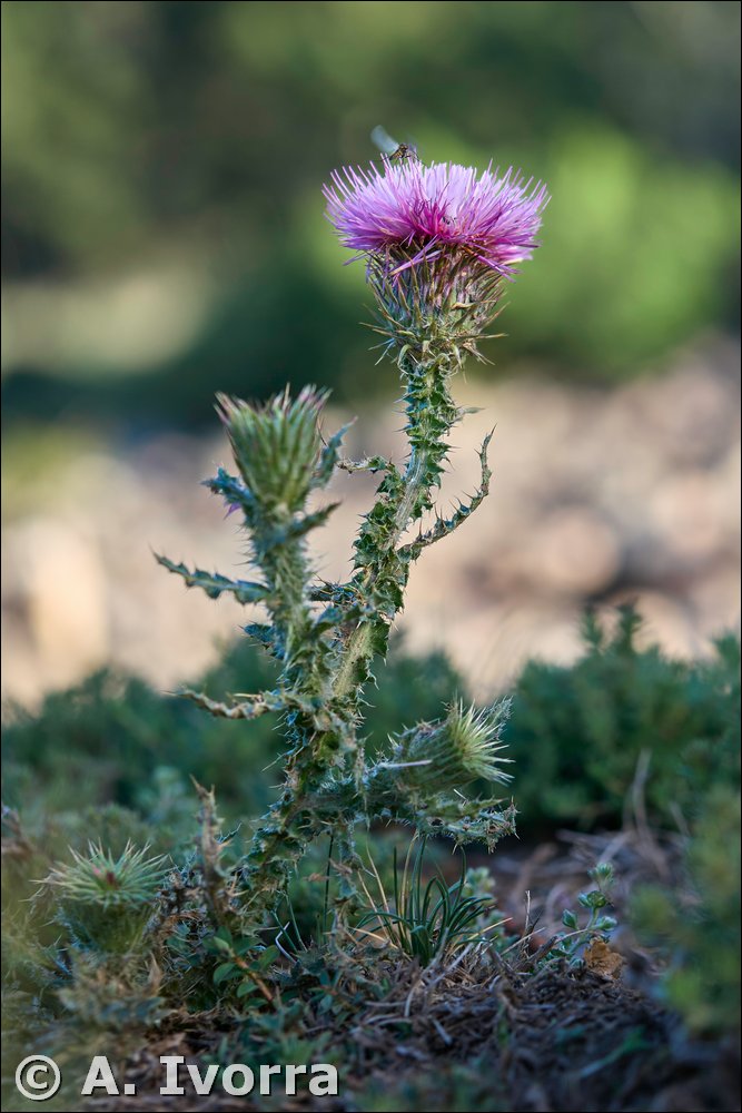 Planta bienal, hasta de 130 cm, espinosa, verde. Tallos erectos, simples o ramificados en la parte superior, alados en casi toda su longitud, con espinas amarillentas. Hojas sésiles, decurrentes, disminuyendo en tamaño hacia la parte superior del tallo, verdes con espinas hasta de 22 mm las basales frecuentemente secas en la antesis. Capítulos solitarios, terminales, sobre pedúnculos blanquecino-tomentosos, áfilos. Involucro de 26-31 x 13-17 mm, ovoide,