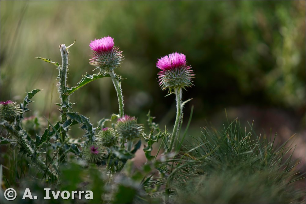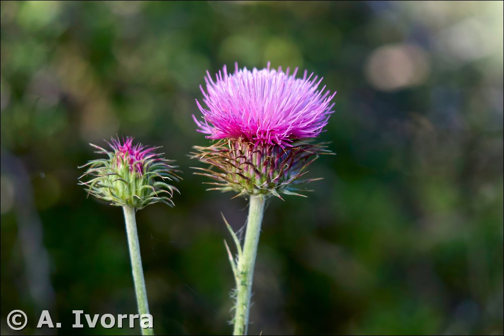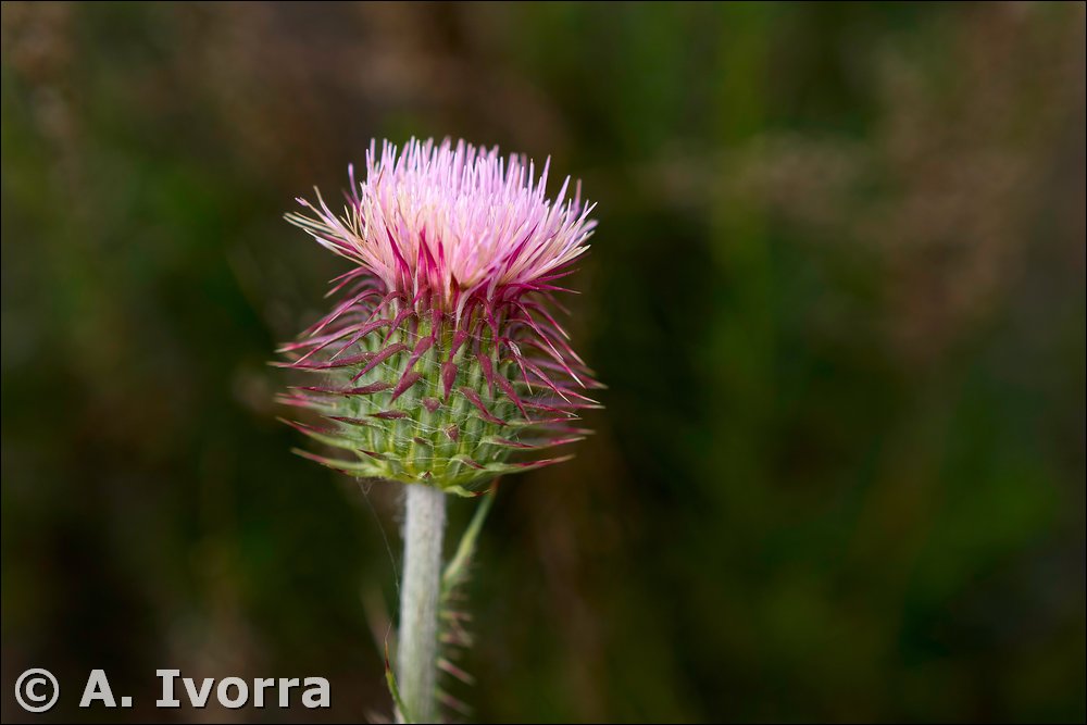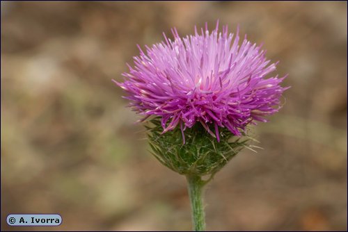 glabrescente. Brácteas aparentemente dispuestas en 5 a 7 series, arqueadas, las externas de más de 20 mm, que sobrepasan las medias y a veces las internas, las medias con espina apical hasta de 15 mm. Receptáculo peloso. Flósculos hermafroditas. Corola de 19 a 24 mm, rosado-purpúrea, glabra. Anteras violetas. Aquenios oblongo-obovoides, pardo grisáceos. Vilano de 19 a 22 mm, caedizo, formado por pelos escábridos soldados en la base.