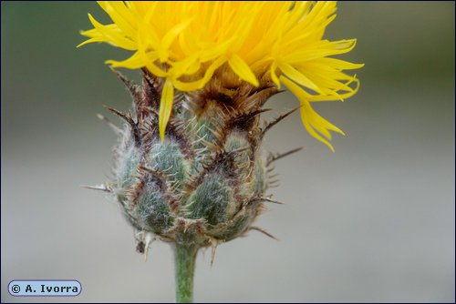 las medias con apéndice apical espinoso, triangular, decurrente, ferruginoso más o menos oscuro, con 6 a 10 pares de fimbrias laterales, hasta de 3 mm, y espina terminal punzante. Flores flosculosas, amarillas o anaranjadas, las externas neutras. Aquenios de 4,5 a 6,5 mm; vilano doble, persistente, rosado o ferruginoso.