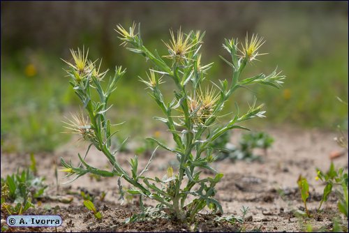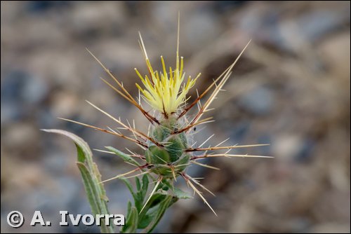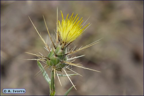 estrechamente ovoideo. Brácteas involucrales medias con espina apical de 15 a 20 mm, muy vulnerante, no