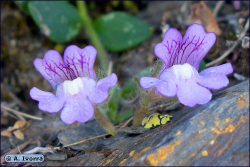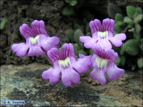 mm, violeta, lila o rosada, con labios divergentes (el superior bilobado y el
