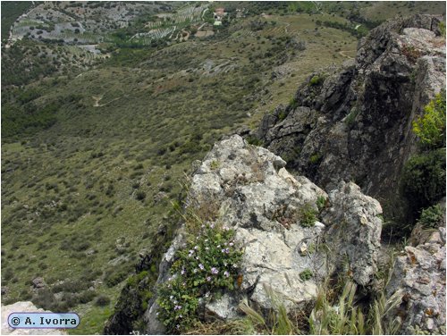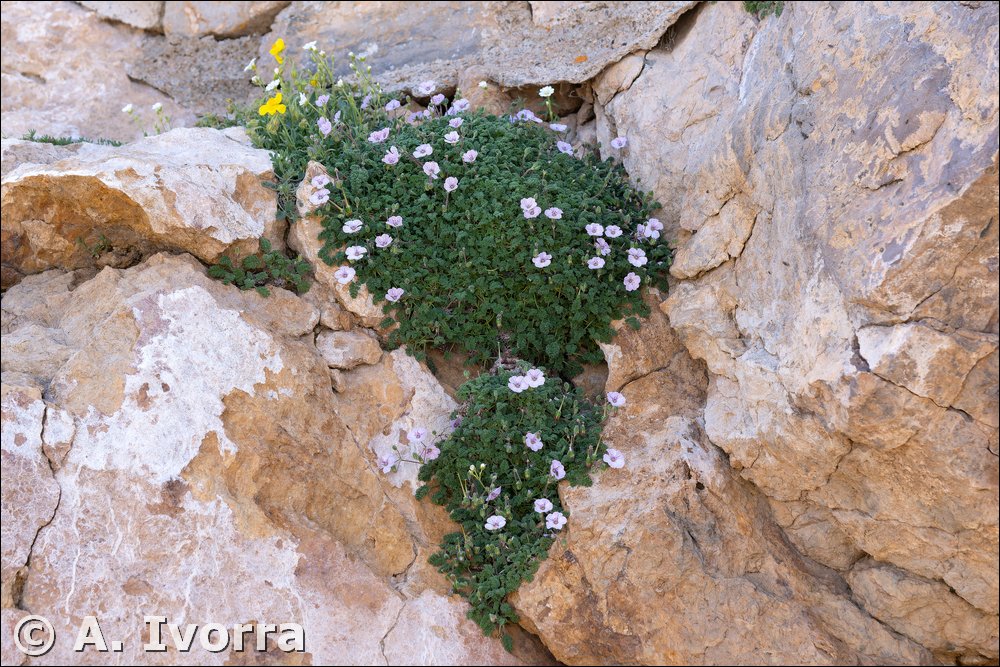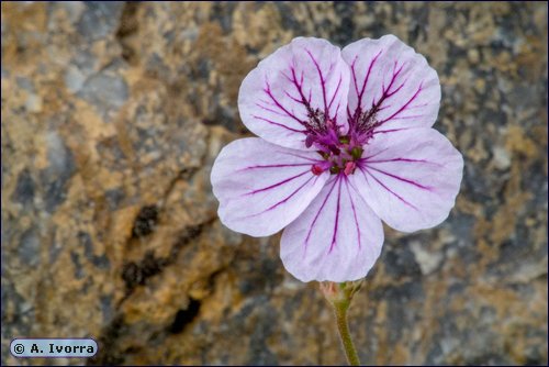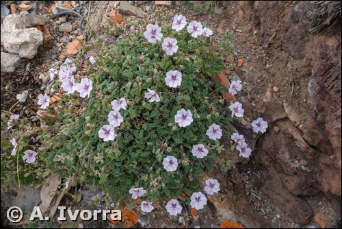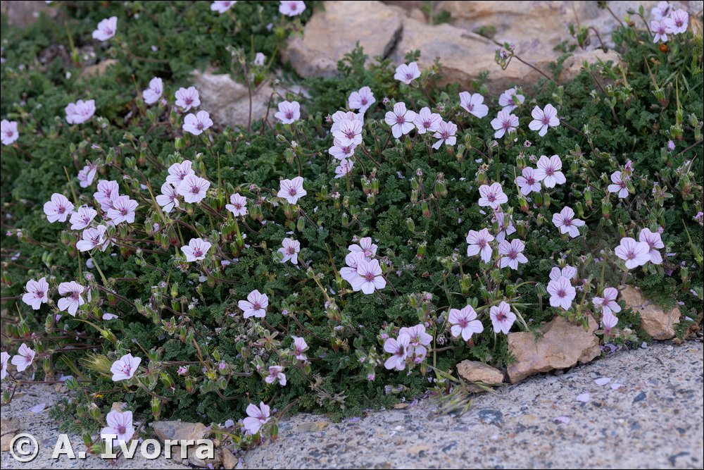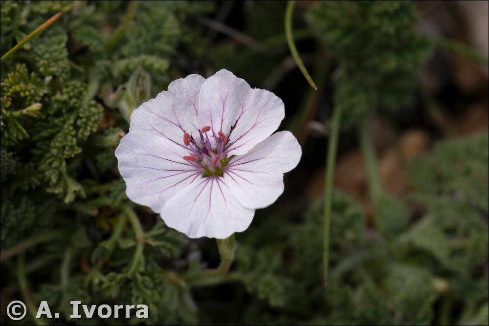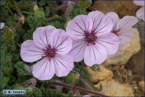 Planta herbácea, vivaz, de 5-15 cm, sin tallo, con pubescencia glandulosa. Hojas pinnatipartidas, a menudo con márgenes revolutos, cubiertas de pelos blanquecinos y "encrespados". Flores hermafroditas, pentámeras, ligeramente zigomorfas. Cáliz con 5 sépalos. Corola con 5 pétalos, blancos, rosados o lilas, con venas rojas, sin mancha en la base. Androceo con 5 estambres. Ovario súpero, pentacarpelar. Fruto esquizocarpo. Mericarpos indehiscentes,