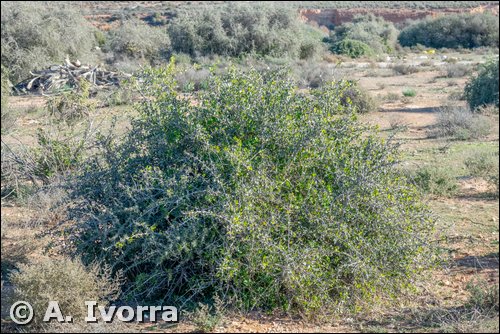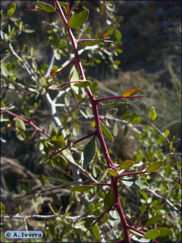 m de altura, con las ramas muy espinosas. Hojas coriáceas, crenadas, cortamente