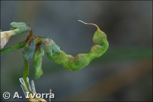 lomento, hasta de 40 x 4 mm, aplanado, papiloso, arqueado, que presenta varios senos