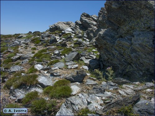 Vive en prados montanos y roquedos en substrato calizo o dolomítico, a veces en substrato silíceo, de 1500 a 2600 m. Se distribuye por el S de la península ibérica, provincias de Almería, Córdoba, Granada, Jaén y Málaga. En Almería la hemos visto en Sierra Nevada.