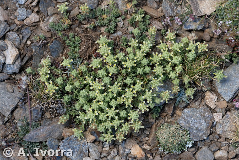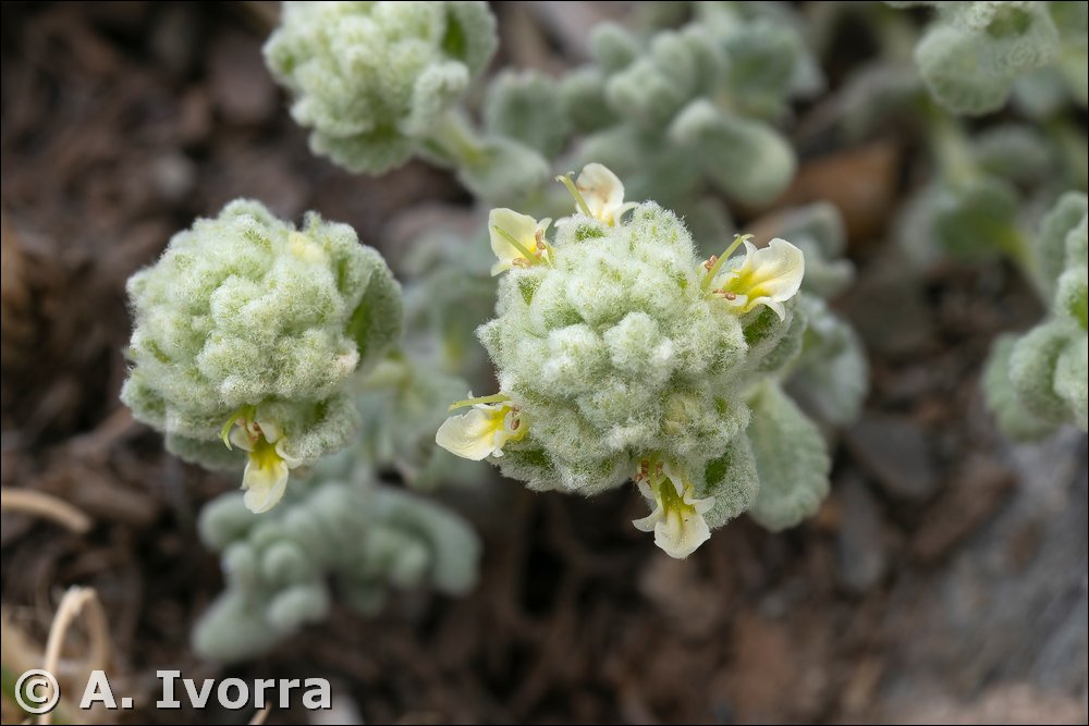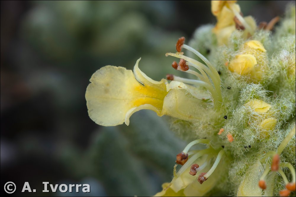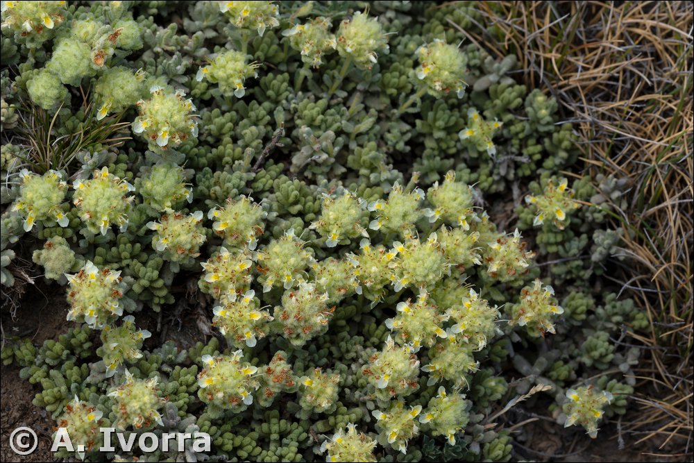 Planta sufruticosa, cespitosa o pulviniforme, con pelos ramificados largos y flexuosos. Tallos con dimorfismo estacional, los vegetativos pardo-blanquecinos y los floríferos amarillentos o amarillos. Hojas opuestas, sésiles, oblongas, cuneadas, crenadas en la mitad o en los dos tercios apicales, planas o revolutas. Inflorescencia en cabezuela terminal, oblonga. Flores zigomorfas, hermafroditas, pentámeras, sésiles. Cáliz verde o amarillo,